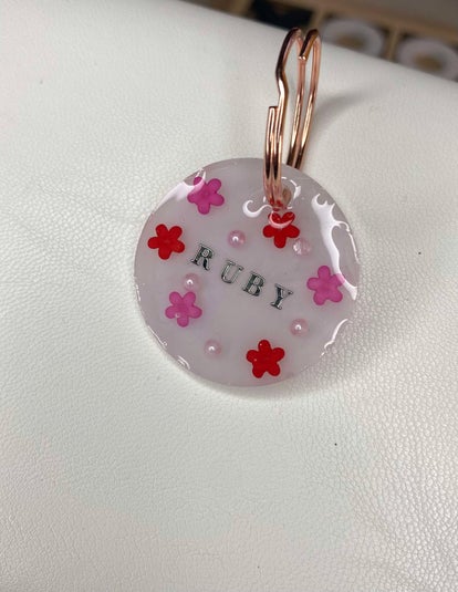 Médaille en forme de coeur, possible de choisir la couleur des contours, faite en résine.